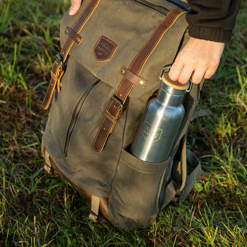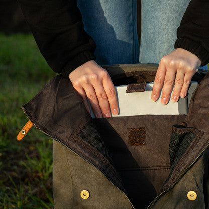 De rugzak is gemaakt van 100% katoenen canvas dat is behandeld met wax. Hierdoor dringt water niet door in de stof – zonder dat er plastic aan te pas komt. Regen? Geen probleem. Alles blijft droog.