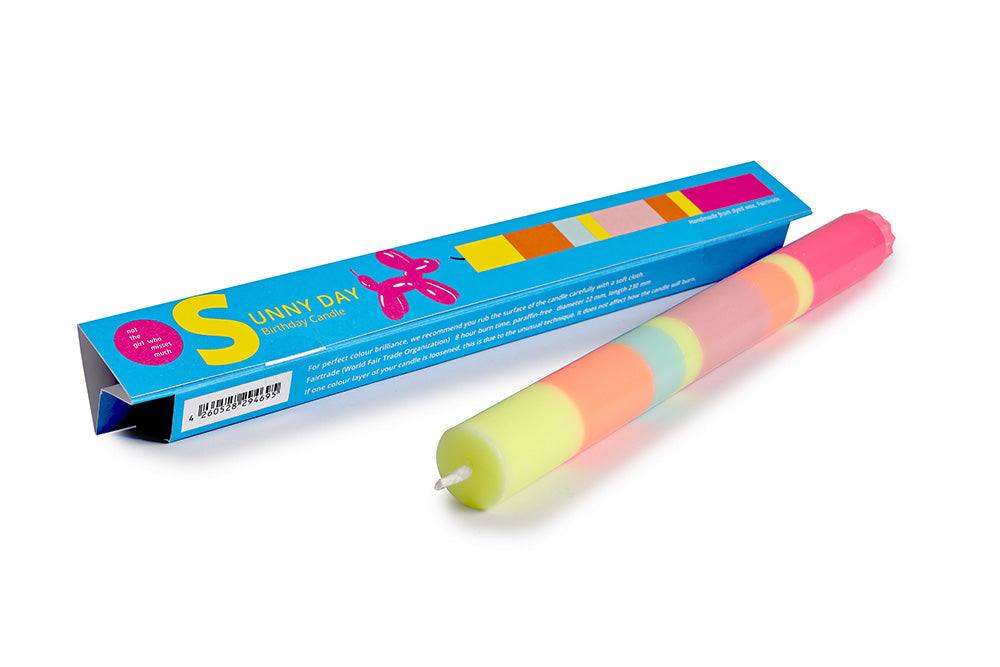 Een cadeau, felicitatie of een groet. Voor elk thema is er een passende kaars, individueel verpakt in een gekleurde kartonnen doos. De kaars is gemaakt van effen gekleurde was die laag na laag tijdens de productie zorgvuldig met de hand wordt gegoten.