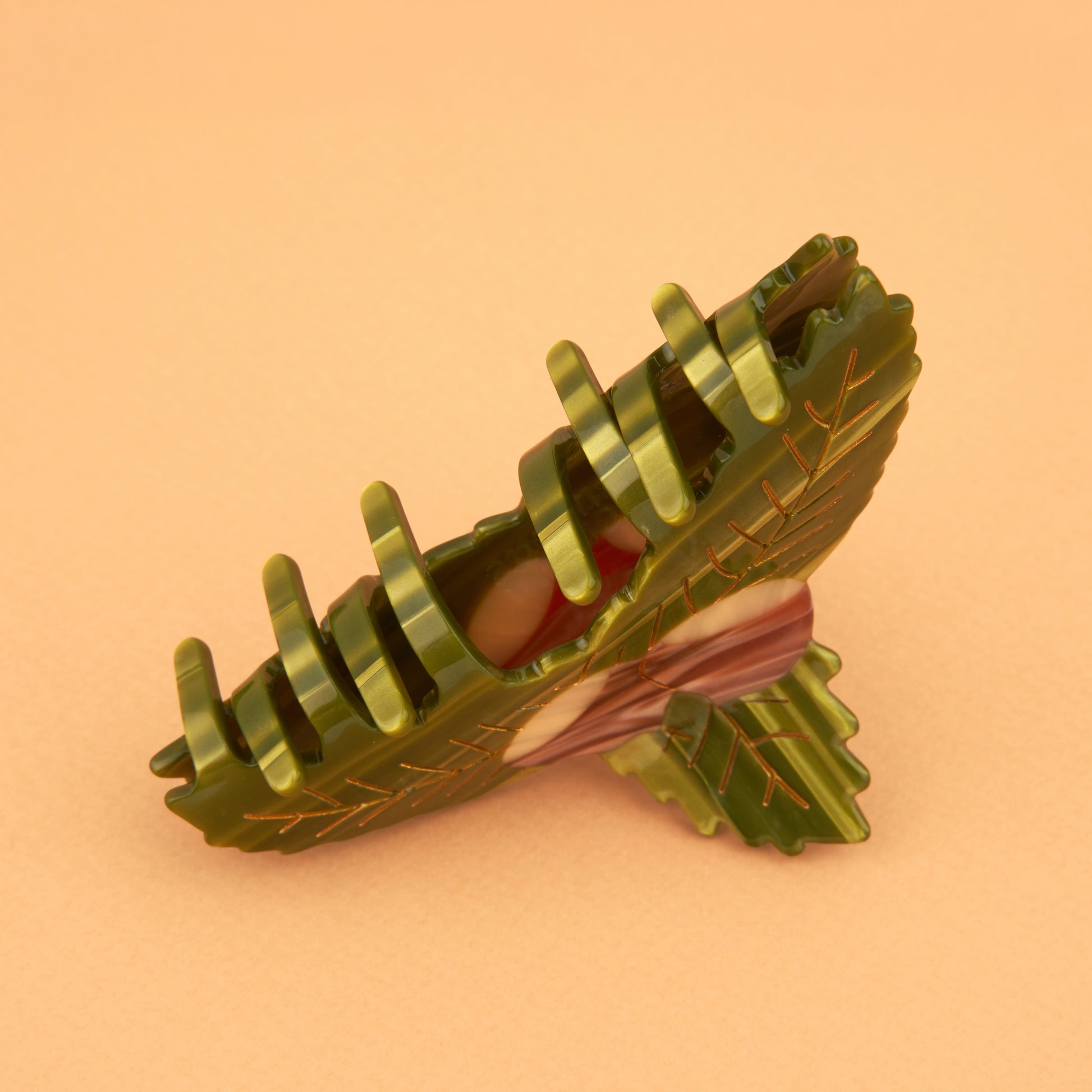 Voor alle fans van grote haarklemmen: hier is de Kastanje Haarklem! Drie prachtige metallic groene blaadjes – geïnspireerd op onze klassieke bladenklem – vergezeld door twee schattige kleine kastanjes, klaar om geroosterd en opgegeten te worden. Perfect voor lang, dik haar en al je gezellige herfstkapsels.