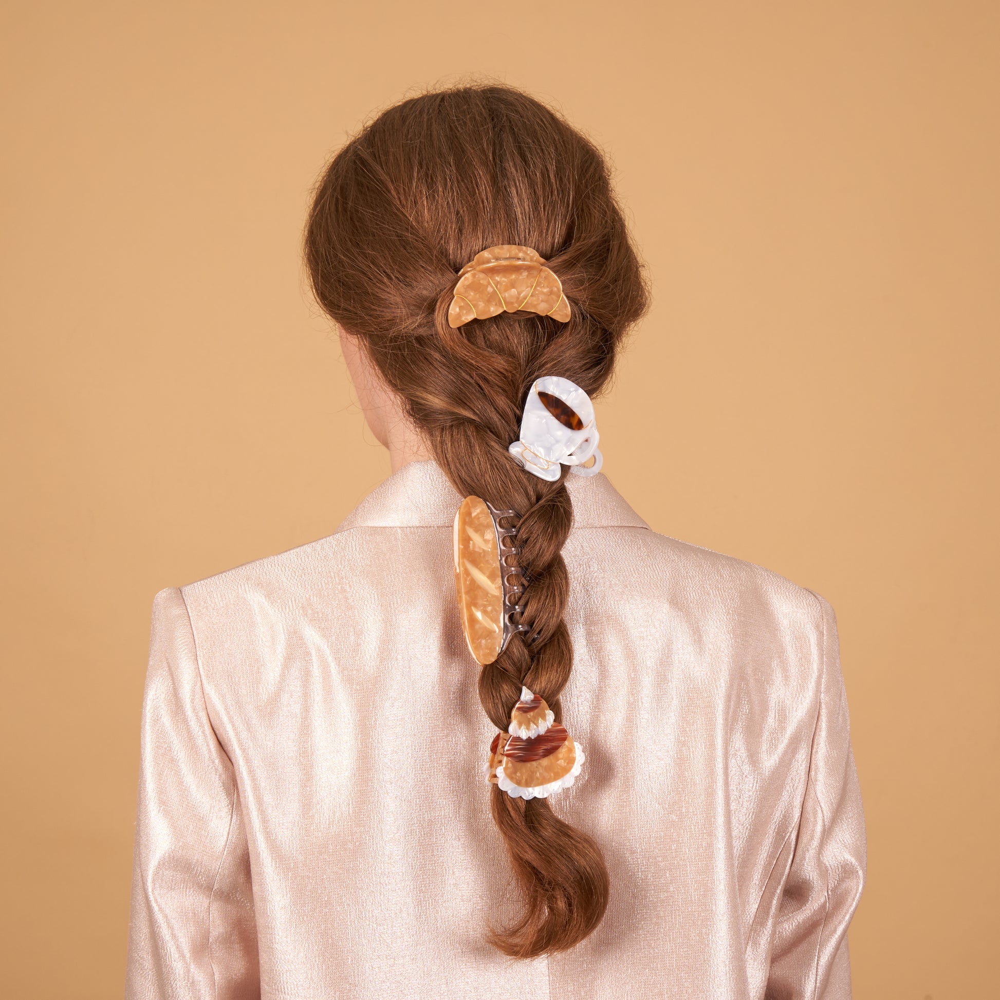 Een haarclip in de vorm van een heerlijk croissantje, helemaal zoals die warme, boterrijke exemplaren uit onze kindertijd. Een vleugje nostalgie dat je overal mee naartoe neemt!