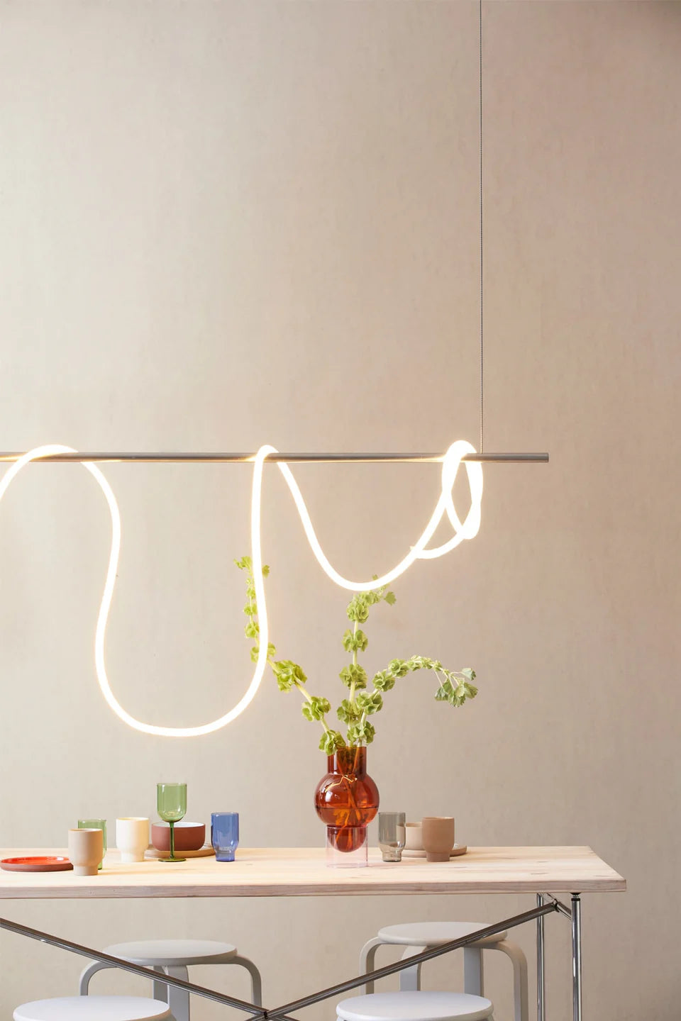 Flex Tube kan worden gebruikt als wand-, tafel- of plafondlamp, of als stijlvol middelpunt op een plank of tafel. Het subtiele, warme licht creëert een rustige en uitnodigende sfeer, perfect voor zowel minimalistische statements als zachte sfeerverlichting.