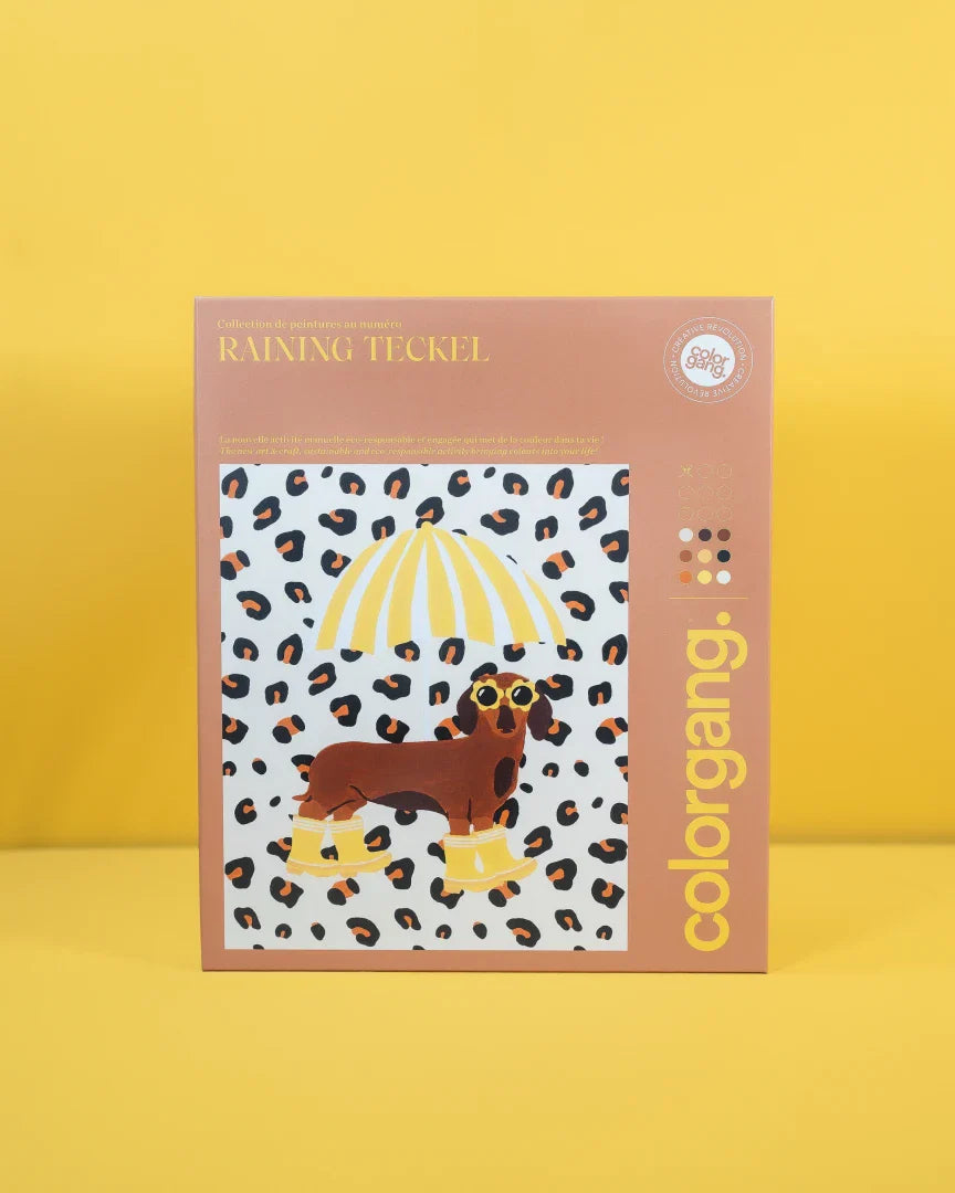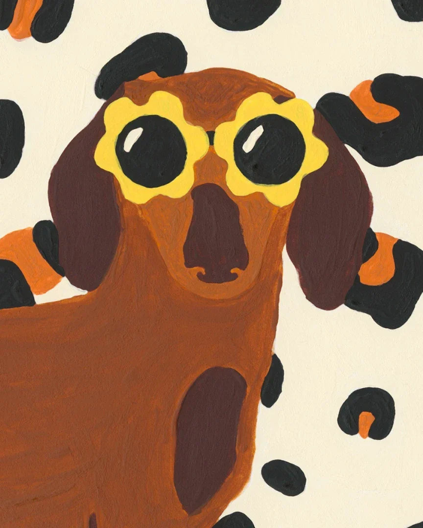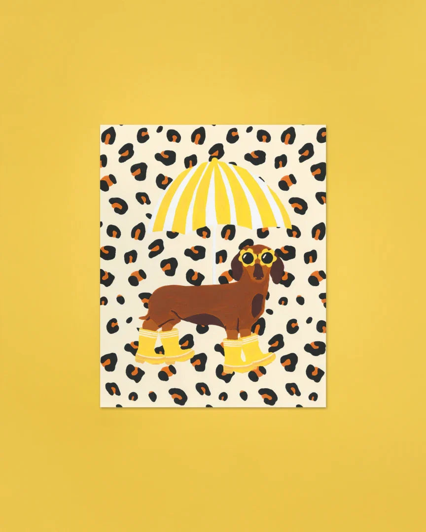 Voor alle teckelliefhebbers, of voor wie gewoon graag een ochtendwandeling om acht uur in de regen maakt. En natuurlijk met een zonnebril voor de stijl… 🐶☂️ Deze illustratie met luipaardachtergrond zal je zeker betoveren.