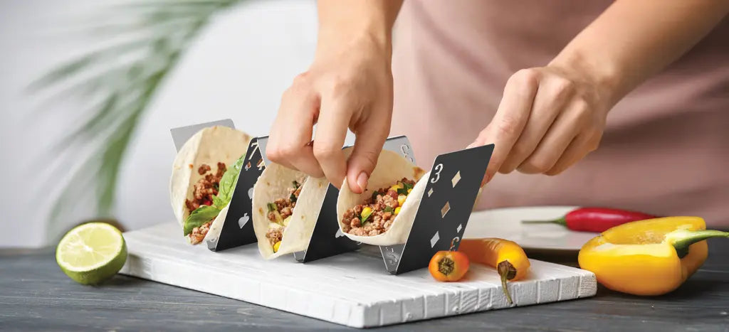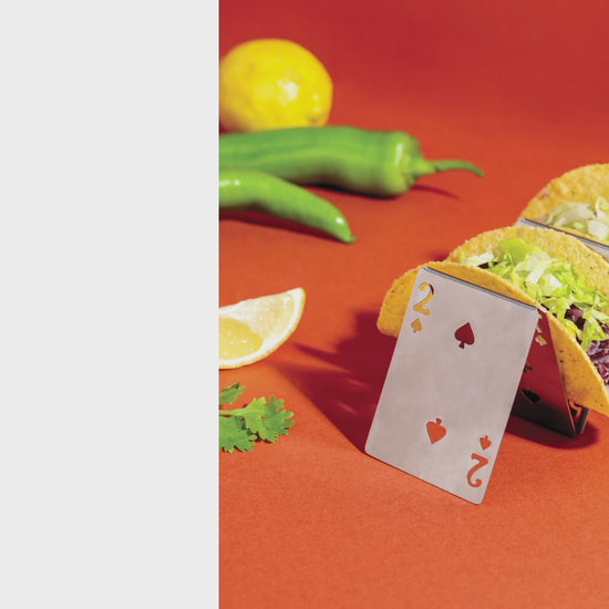 De Pick-a-Taco van Ototo combineert strak roestvrij staal met een speelse knipoog. Deze set van twee stevige tacohouders zorgt ervoor dat taco's goed rechtop blijven staan, zodat vullen en serveren zonder knoeien gaat. Het materiaal is 100% voedselveilig, BPA-vrij en vaatwasmachinebestendig. Perfect voor taco avonden, feestjes of een doordeweekse avond.