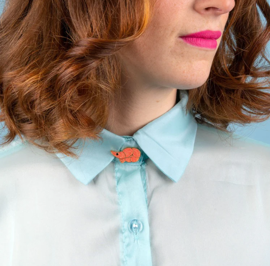 Een schattige garnalen-pin die overal schittert met zijn glitters, gouden details en kleine strassteentje als oog. We zijn helemaal verliefd op dit accessoire dat eruitziet als echt juweel- schattig, maar ook heerlijk kitsch. Lang leve garnalen!