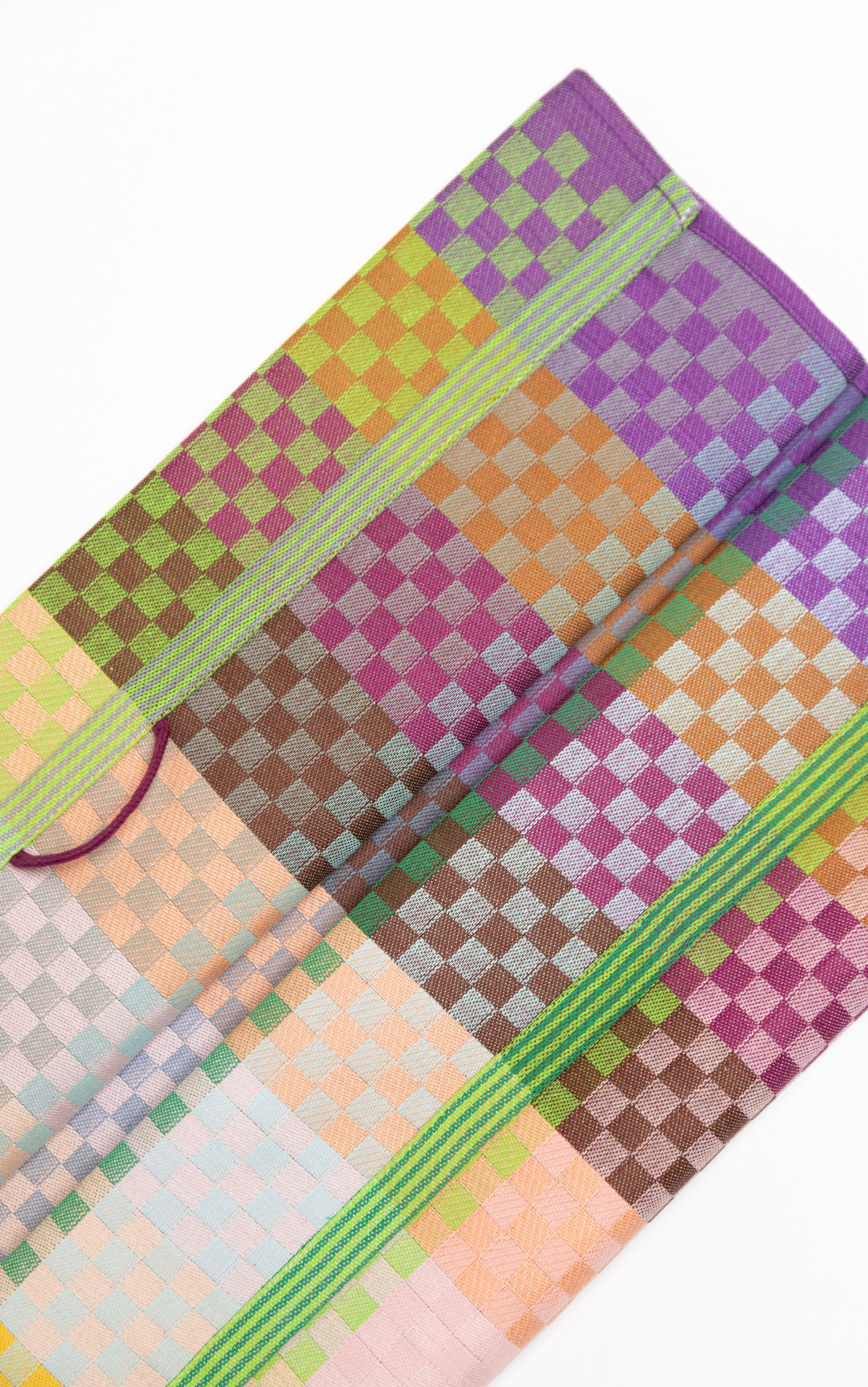 Checkered Check is precies wat de naam belooft: een ruit over een ruit. Dit gelaagde ontwerp speelt op een speelse manier met verschillende restjes garen die zowel in de inslag als in de ketting zijn verwerkt.
