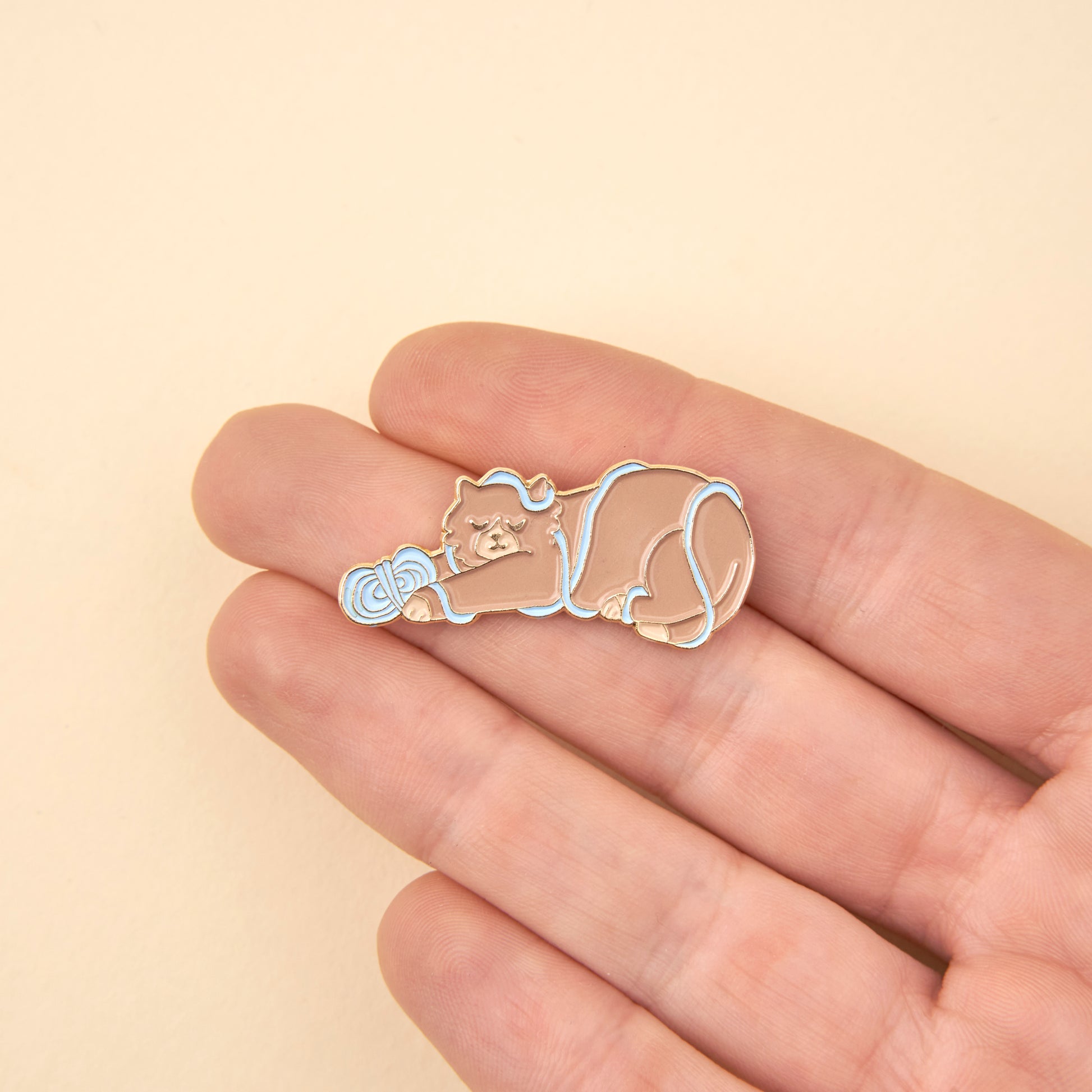Gaspar heeft zich weer eens misdragen en is in onze breiwerken gevlogen. Maar we vergeven hem meteen - hij blijft nu eenmaal het schattigste katertje, helemaal opgerold in zijn bolletje wol. Een originele pin die perfect past op elke jaskraag!